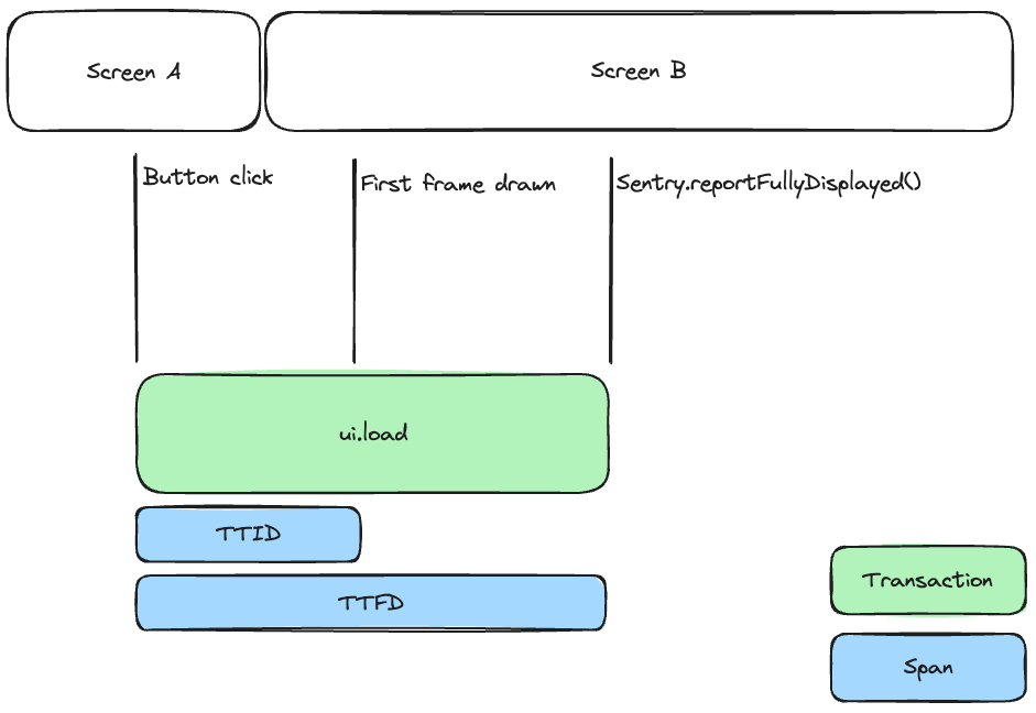 By adding a span for each launch of an activity, time to full display (TTFD) provides insight into how long it would take for your activities to launch and load all of their content. The SDK sets the span operation to ui.load.full-display and the span description to the activity's name followed by full display - for example, MainActivity full display.